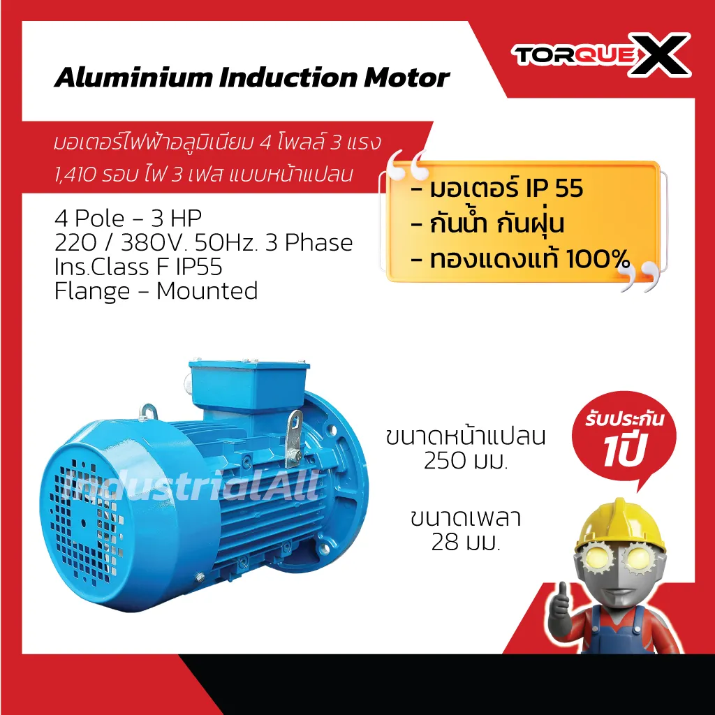 TORQUE X เป็นมอเตอร์ไฟฟ้าประสิทธิภาพสูง ขดลวดทำจากทองแดงแท้ 100% มอเตอร์เป็นรุ่นที่สามารถกันน้ำกันฝุ่นได้ในระดับ IP55 สามารถใช้งานภายนอกได้ปลอดภัย มอเตอร์เหมาะสำหรับการใช้งานกับเครื่องจักร ปั้มน้ำ พัดลม และทางร้านเรามีจำหน่ายมอเตอร์ทั้งแบบขาตั้ง แบบหน้าแปลน หรือขาตั้งหน้าแปลนในตัวเดียวกัน มีมอเตอร์ 1 เฟส 2 สาย และ มอเตอร์ 3 เฟส 3 สาย