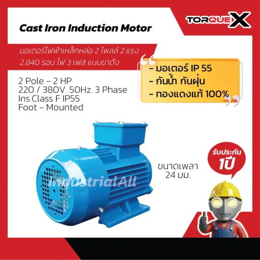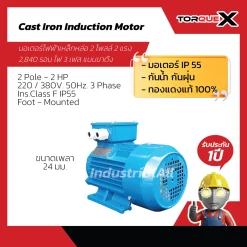 มอเตอร์ไฟฟ้าเหล็กหล่อ แบบขาตั้ง 3 เฟส (สาย) 220/380V. 2 Pole (โพล) 3000 รอบ ขนาด 2 แรงม้า (2 HP) สามารถใช้งานภายนอกอาคาร